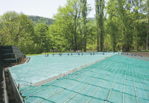 また、植生板には大量の有効基材の装着を可能にし、永続的な緑化を目的に開発した人工張芝です。