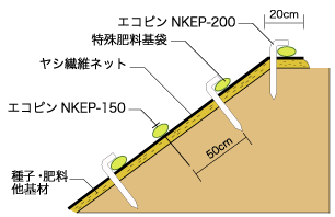 - 生分解性ピン(エコピンNKEP)を使用することにより、ヤシ繊維と共に自然分解します。