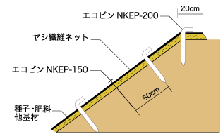 ![]() | 長期肥効型ヤシネットマットはヤシ繊維が地面に密着し表面土砂の流出や寒冷地及び高冷地凍上崩落を防止し法面の保護に優れた効果を発揮します。 また、ヤシネットの優れた保水性により、種子の発芽を促進し、生育を安定させます。 |
